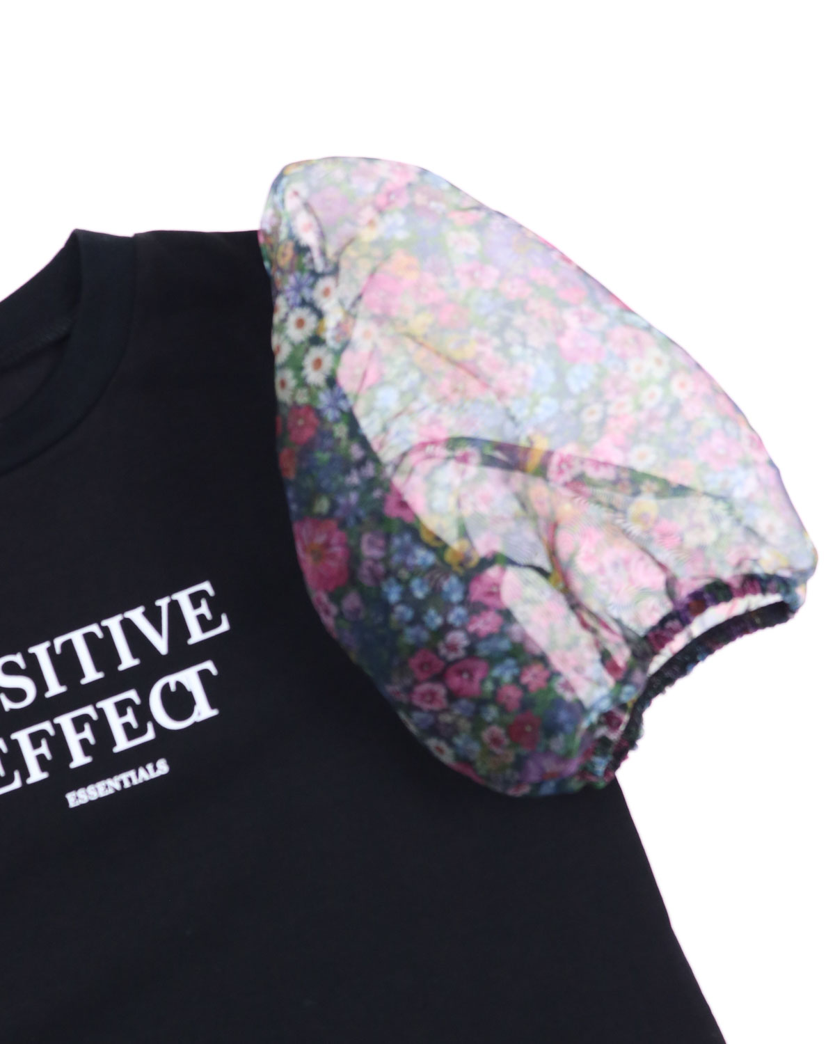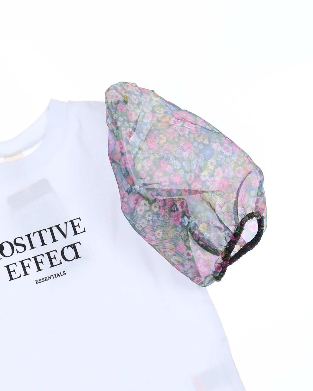 Однотонная блузка с контрастным принтом выполнена из мягкого хлопкового трикотажа, рукава – из полупрозрачной органзы в цветочек. Прямой крой, круглый вырез горловины, короткие рукава-фонарики на резинке.