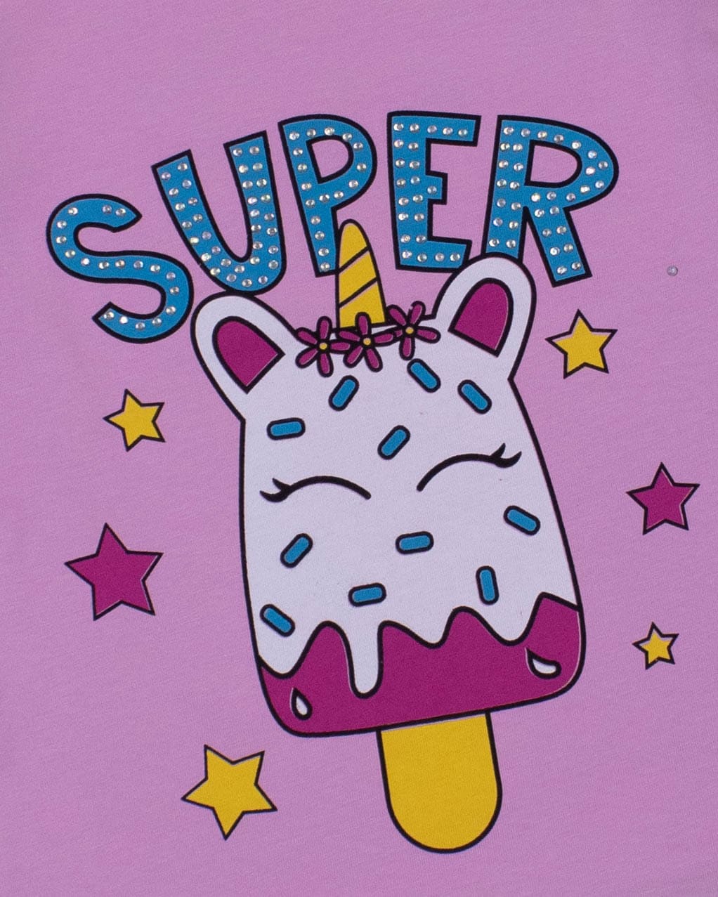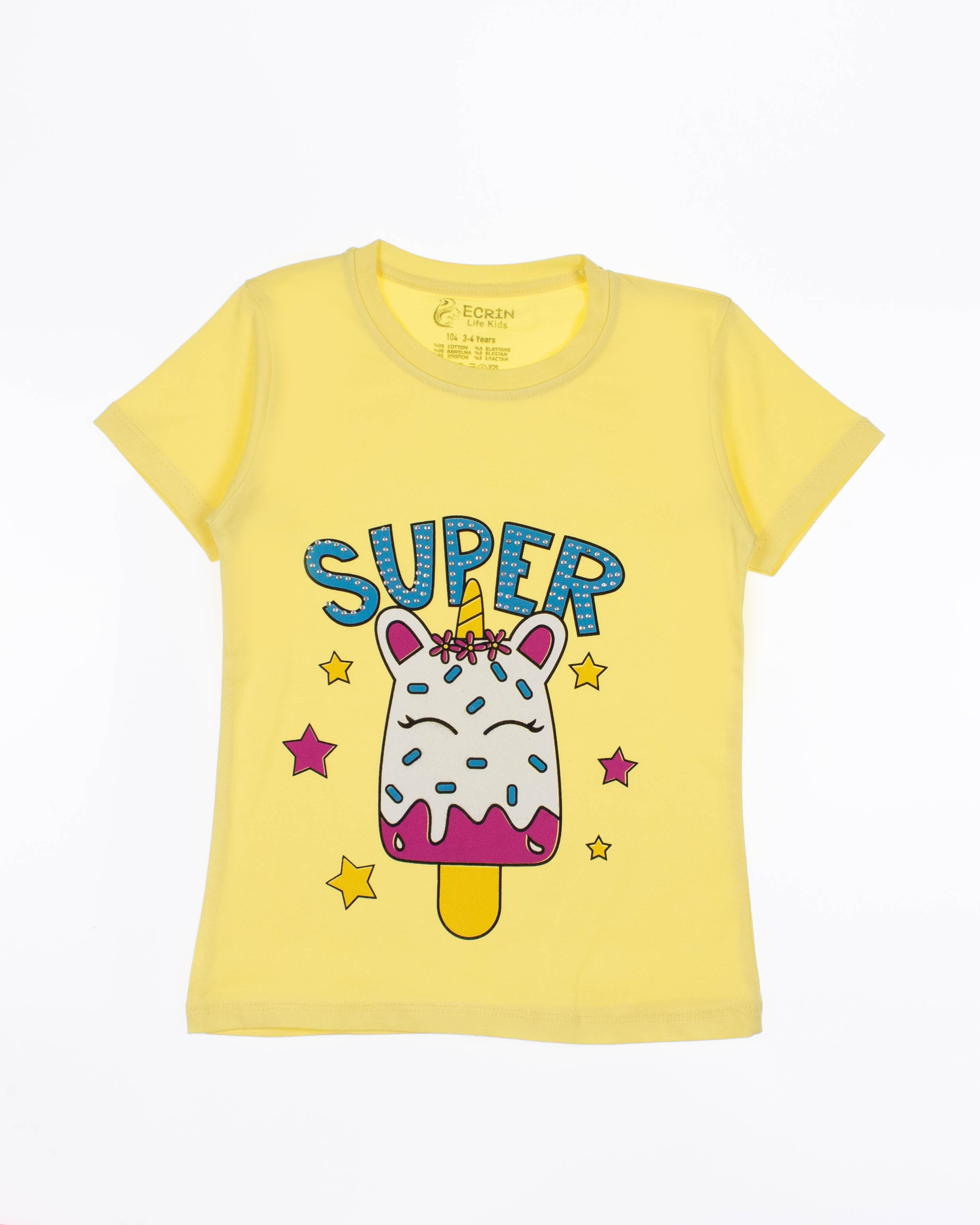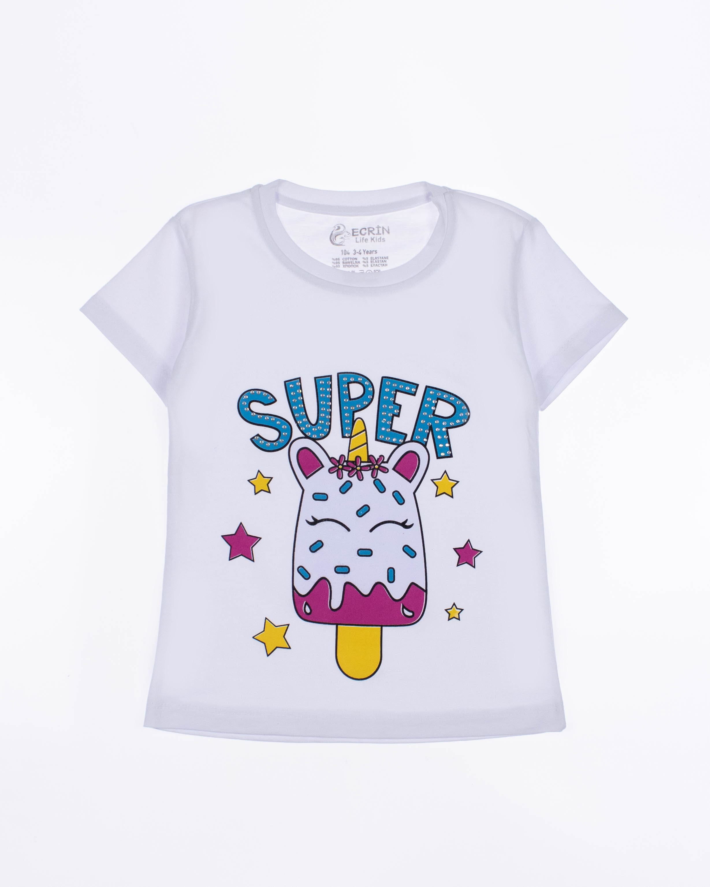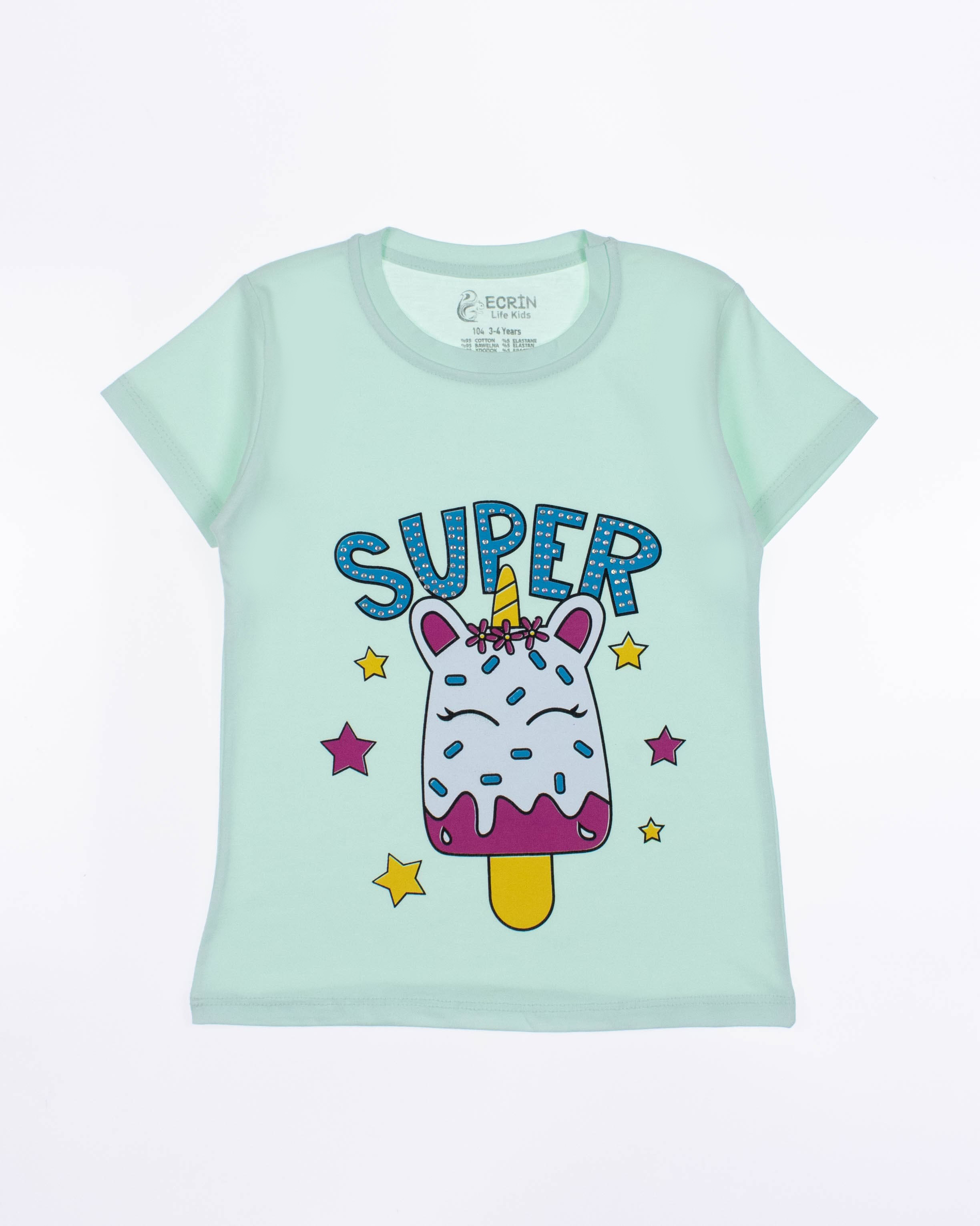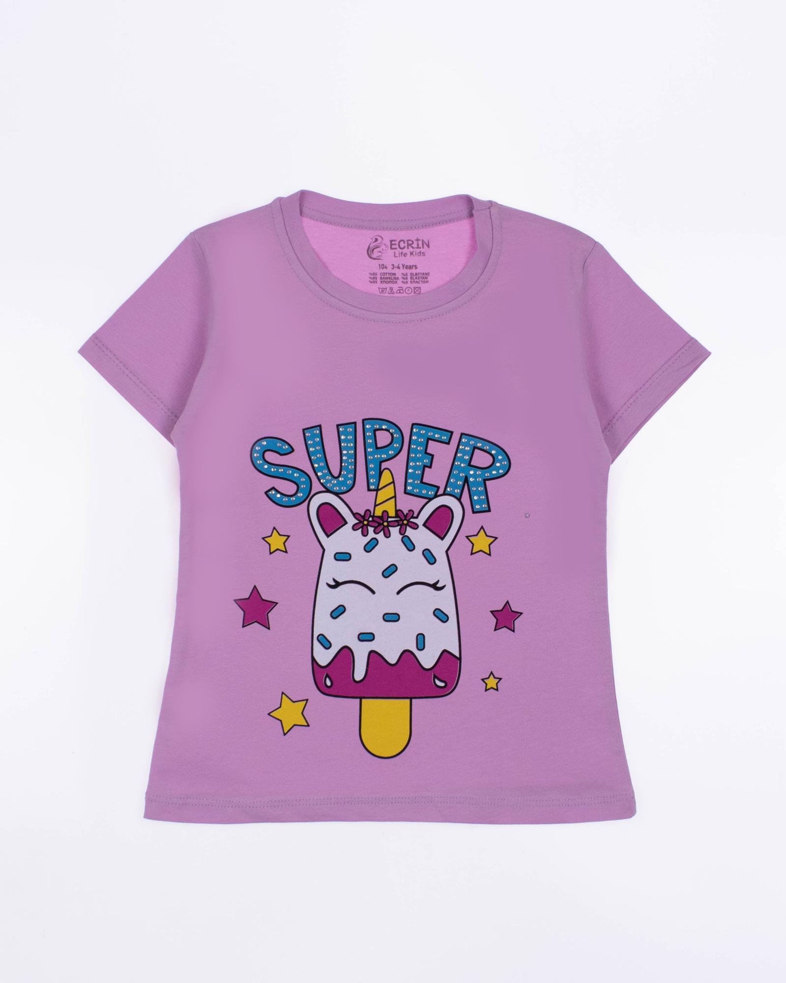 Футболка ECRIN  для девочки оптом, производства Турция. Модель приталенного силуэта с короткими рукавами  и милым принтом. Принт украшен стразами.