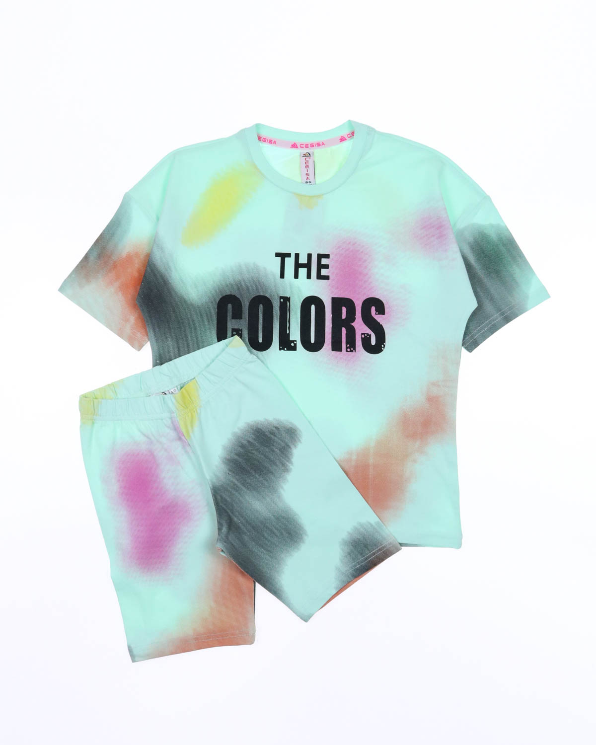 Модель включает в себя футболку свободного силуэта со спущенным плечом и велосипедки.