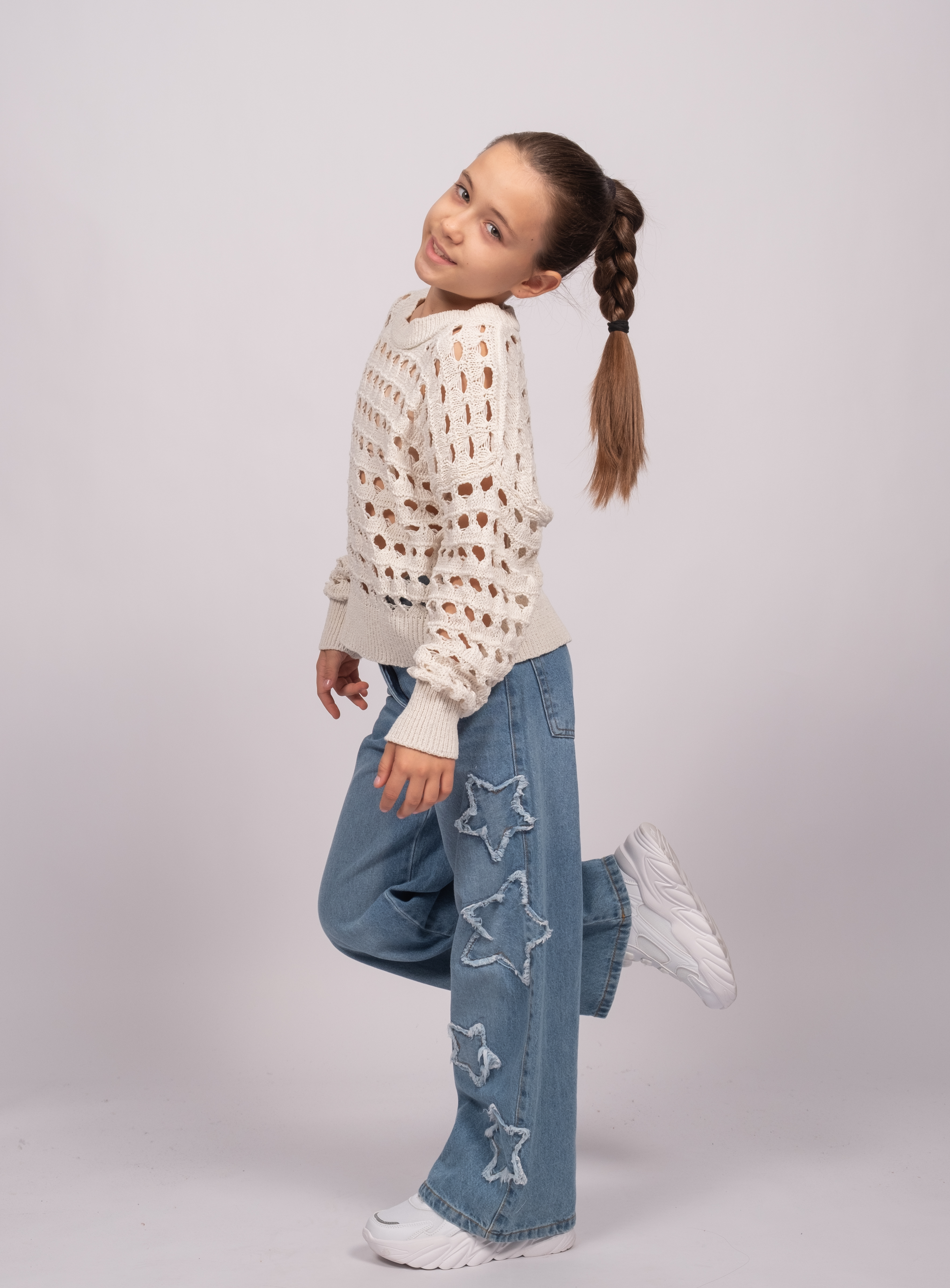 Джемпер DMB для девочек ажурной вязки оптом, выполнен из 100% хлопка. Свободный крой, круглый вырез горловины. Модель отлично сочетается с любой одеждой. Под низ можно надеть удлиненный или короткий топ в тон джемперу.