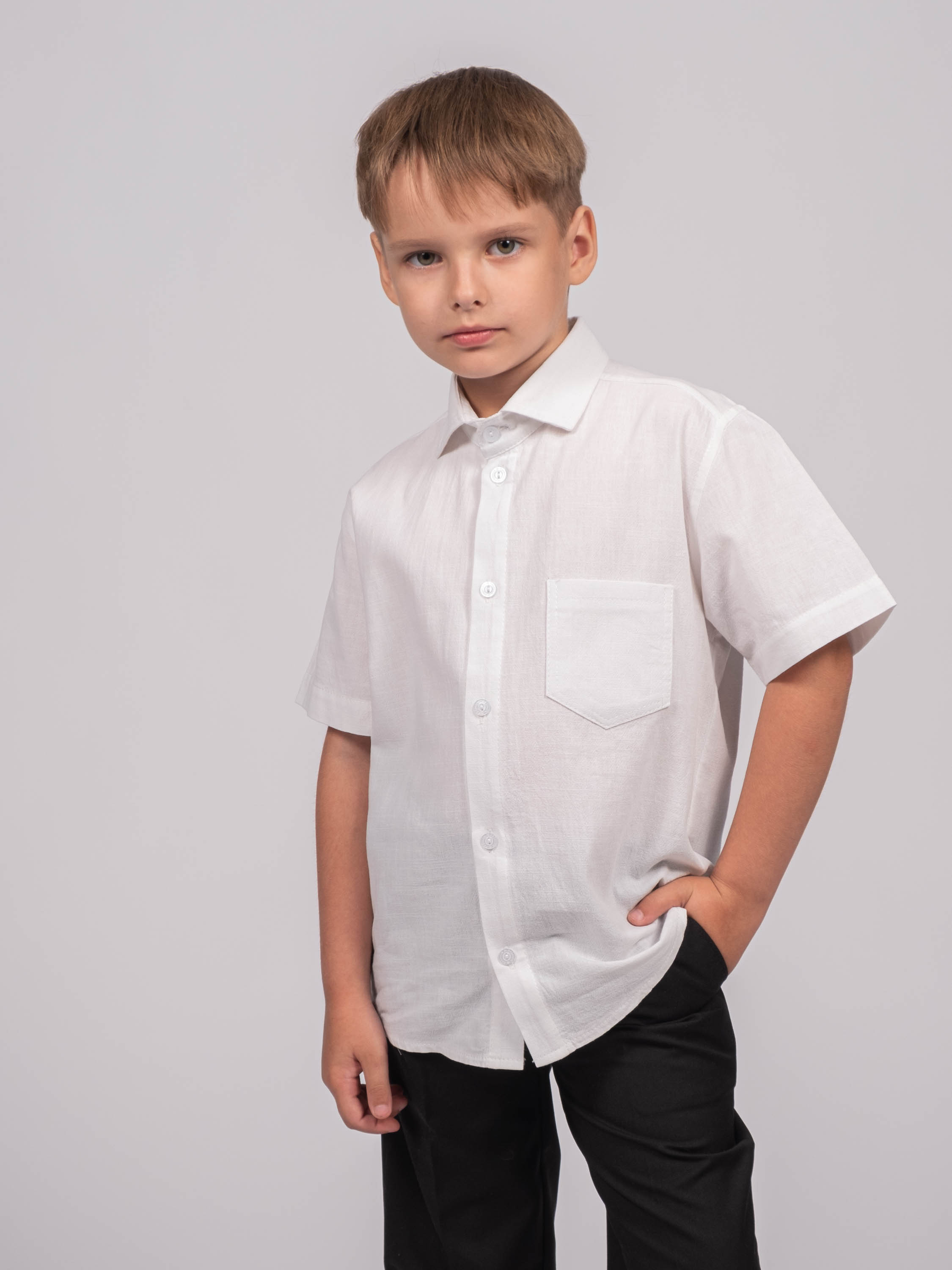 Детская однотонная рубашка для мальчика оптом. Рубашка изготавлена  из хлопка высокого качества. Модель застегивается на пуговицы.