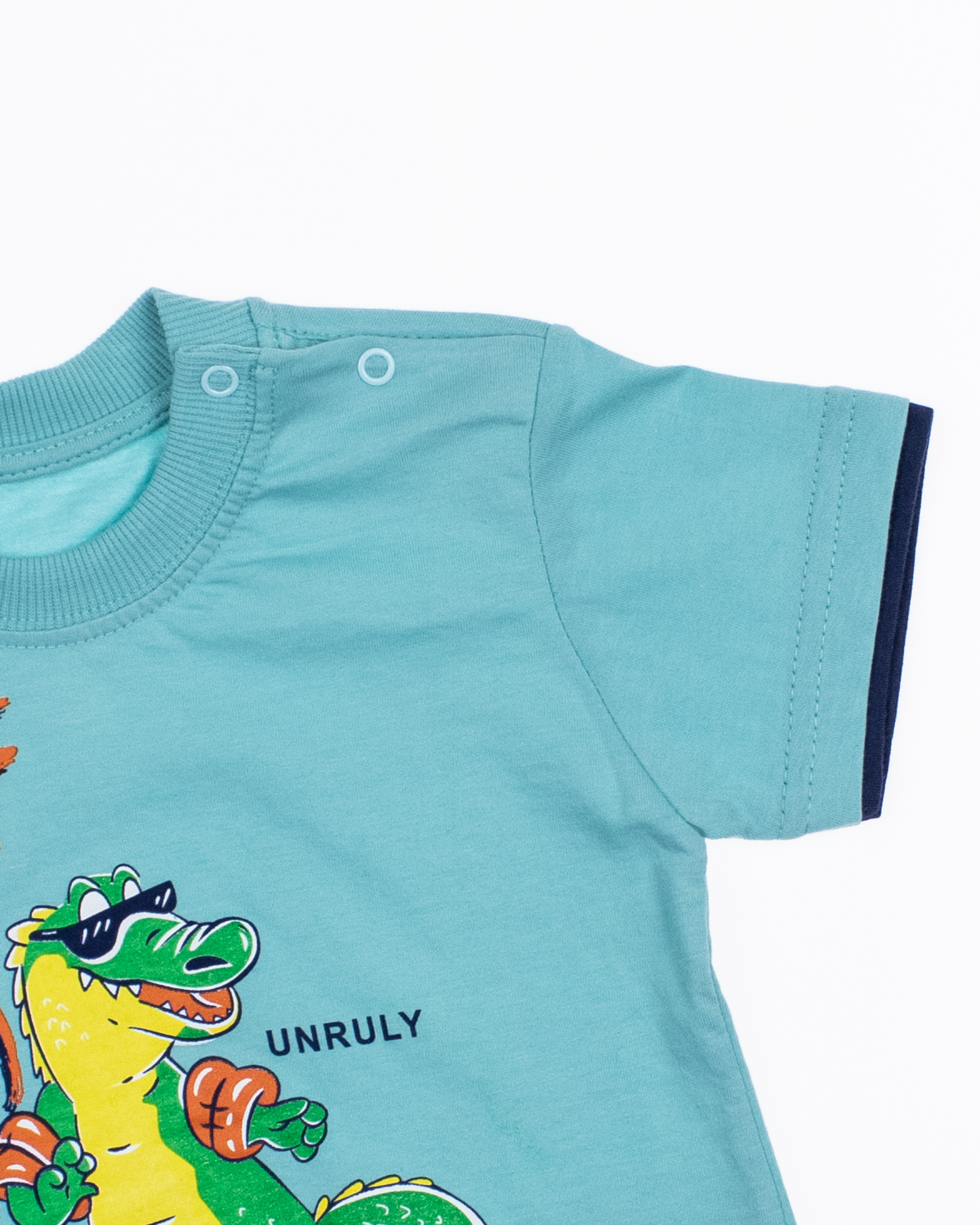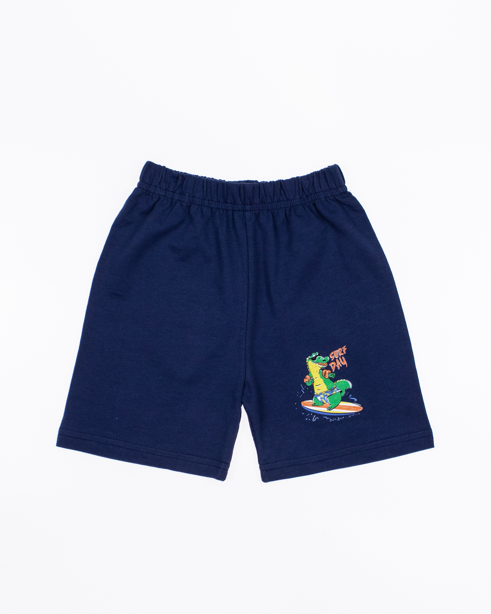 Костюм для мальчика, состоит из футболки и шорт. Модель выполнена из хлопкового полотна и оформлена печатным принтом. Футболка прямого кроя, с округлым вырезом горловины, на плече застежка- кнопки. Ткань кулирная гладь.