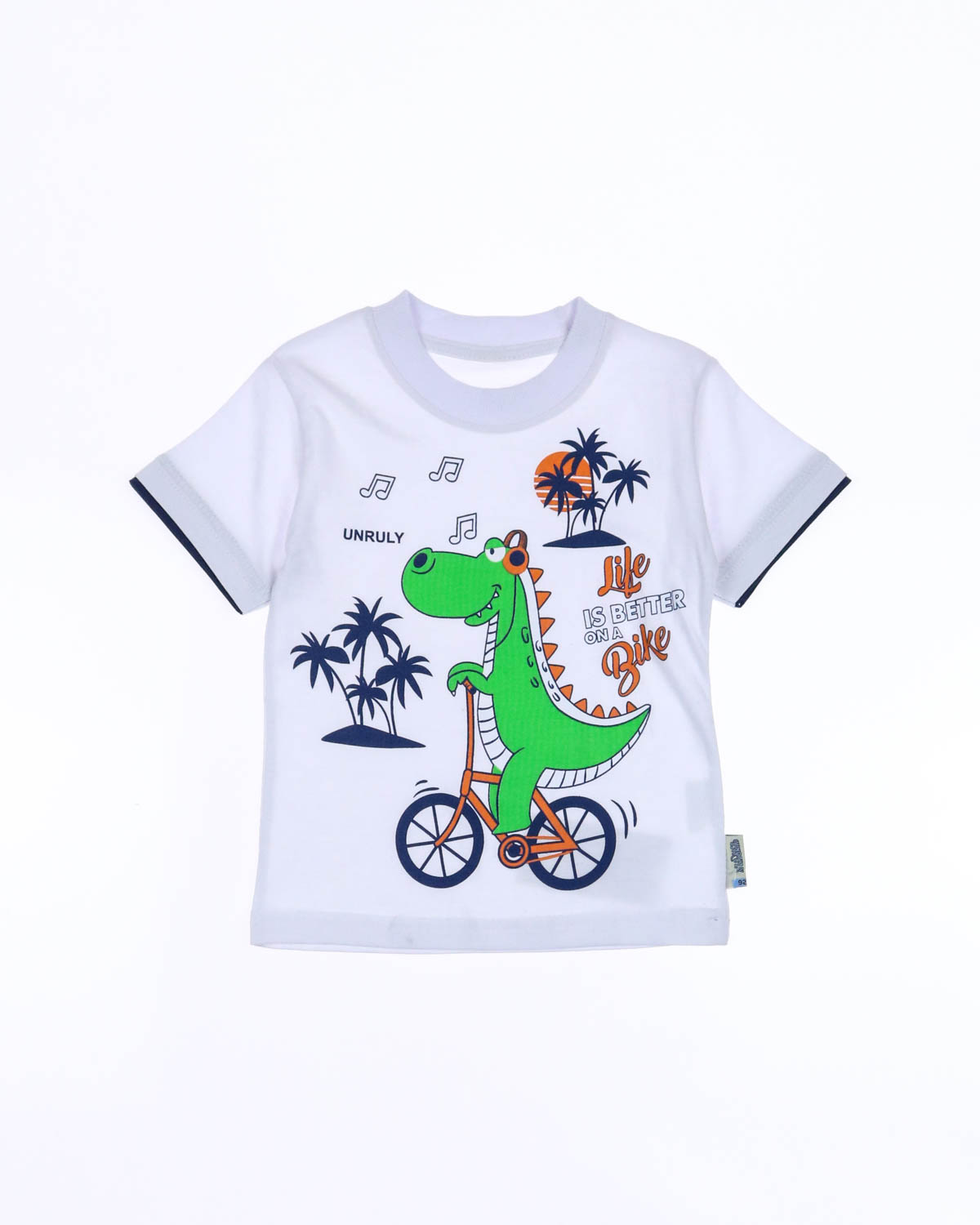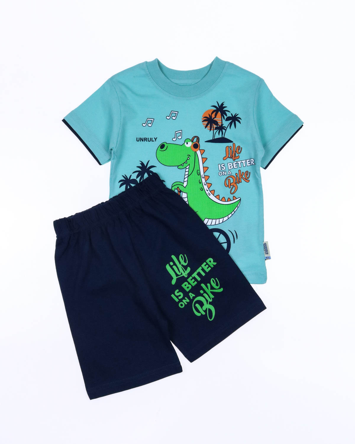 Костюм для мальчика, состоит из футболки и шорт. Модель выполнена из хлопкового полотна и оформлена печатным принтом. Футболка прямого кроя, с округлым вырезом горловины. Ткань кулирная гладь.