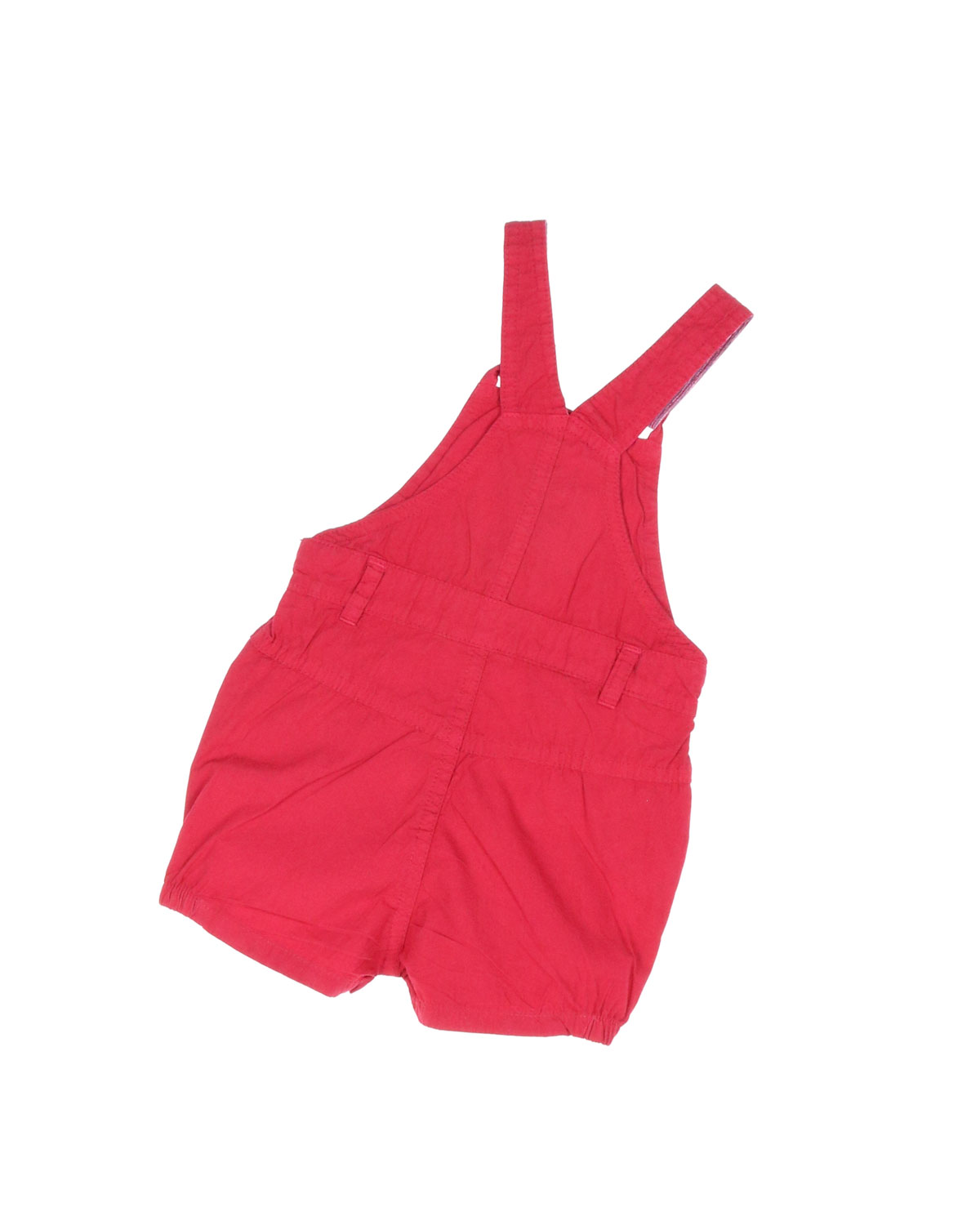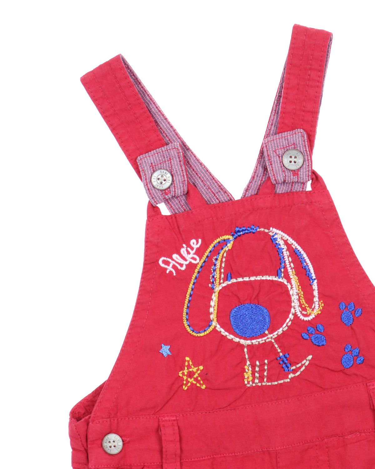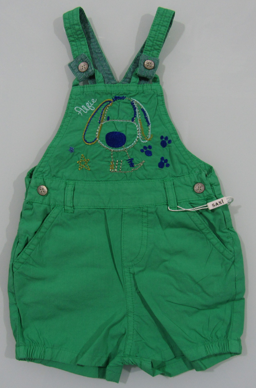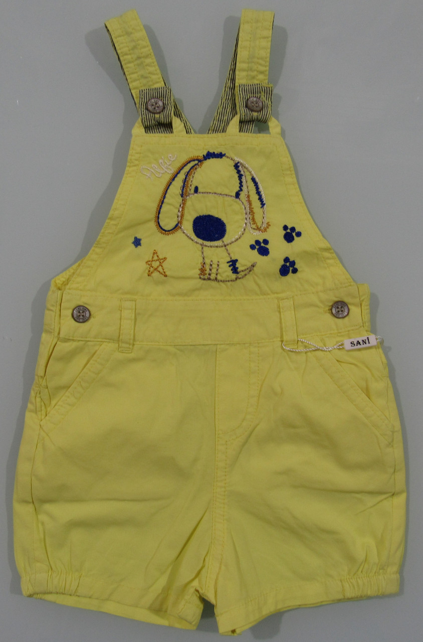 Комбинезон выполнены из 100% хлопка, лямки фиксируются на пуговицы. На груди расположена вышивка собачки.