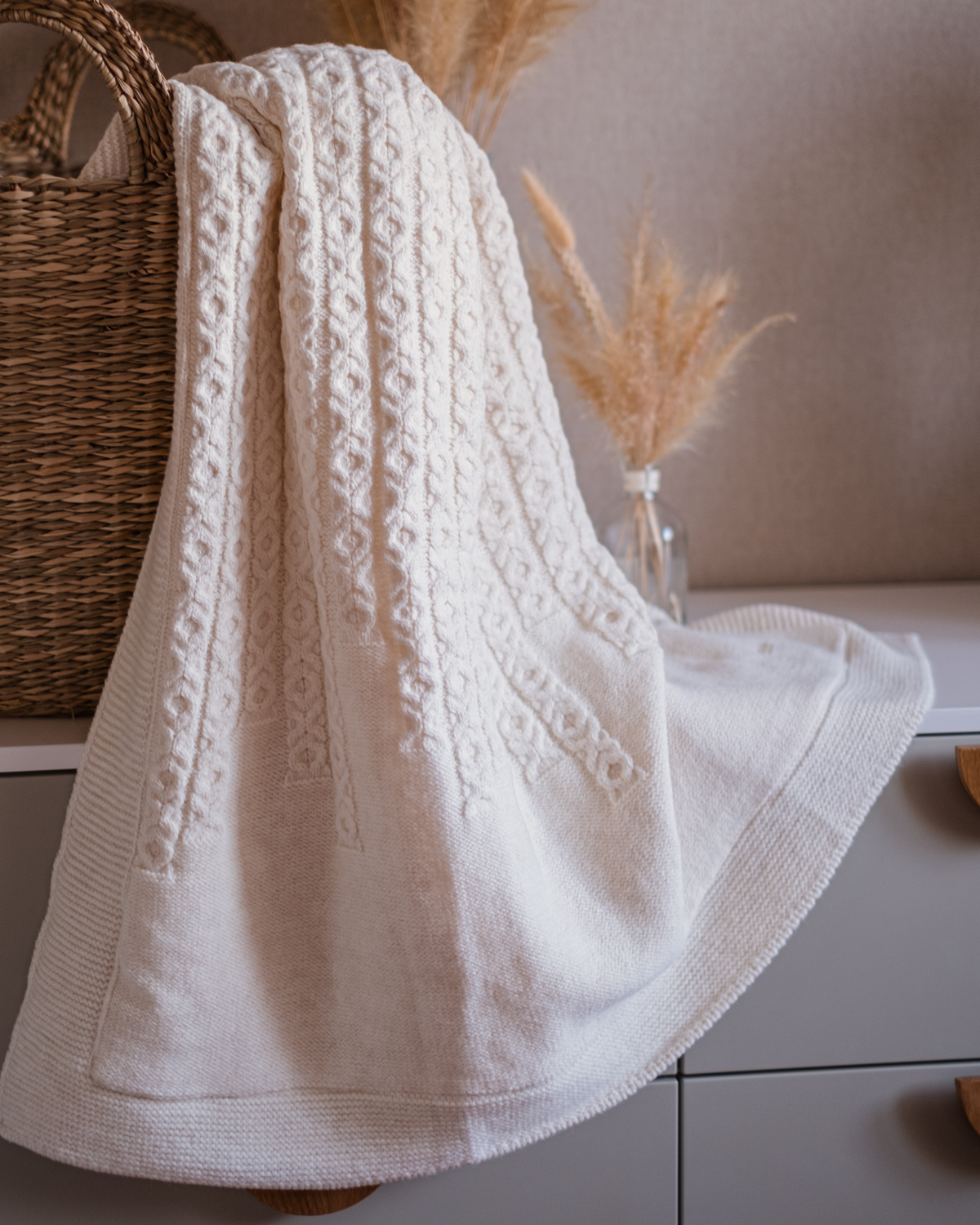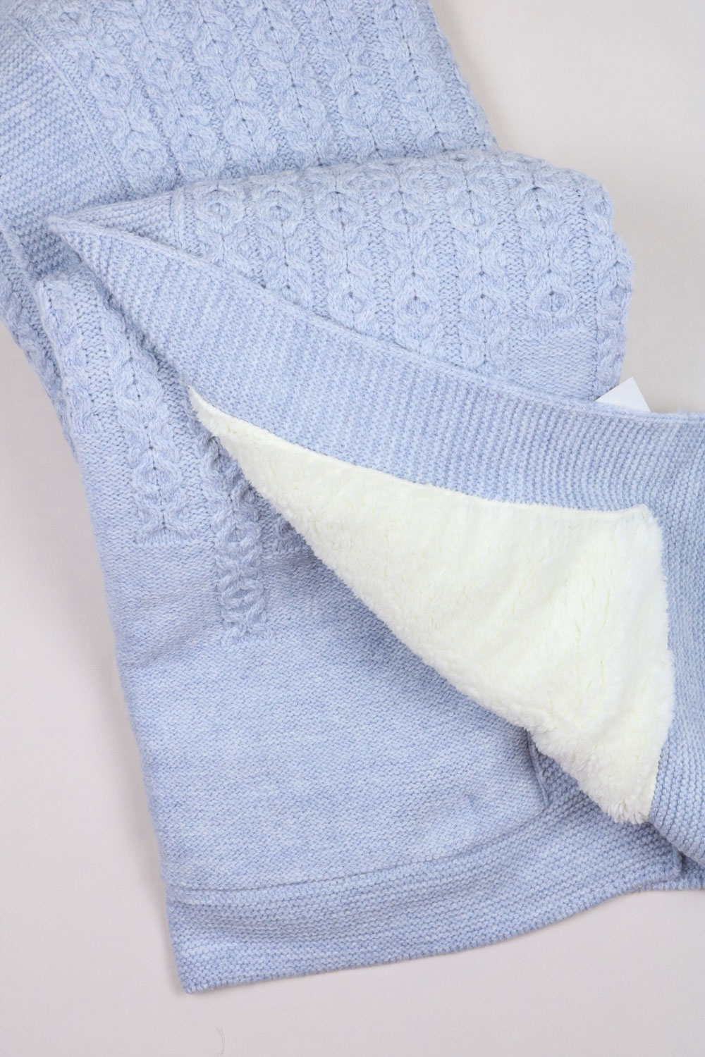 В составе этого пледа 20% шерсти. С лицевой стороны выполнен вязаный узор, а с изнаночной он утеплен подкладом из ткани вельбоа, ее еще называют искусственным плюшем. Она мягкая, теплая и приятная на ощупь.  Под таким пледом малыш точно не замерзнет.